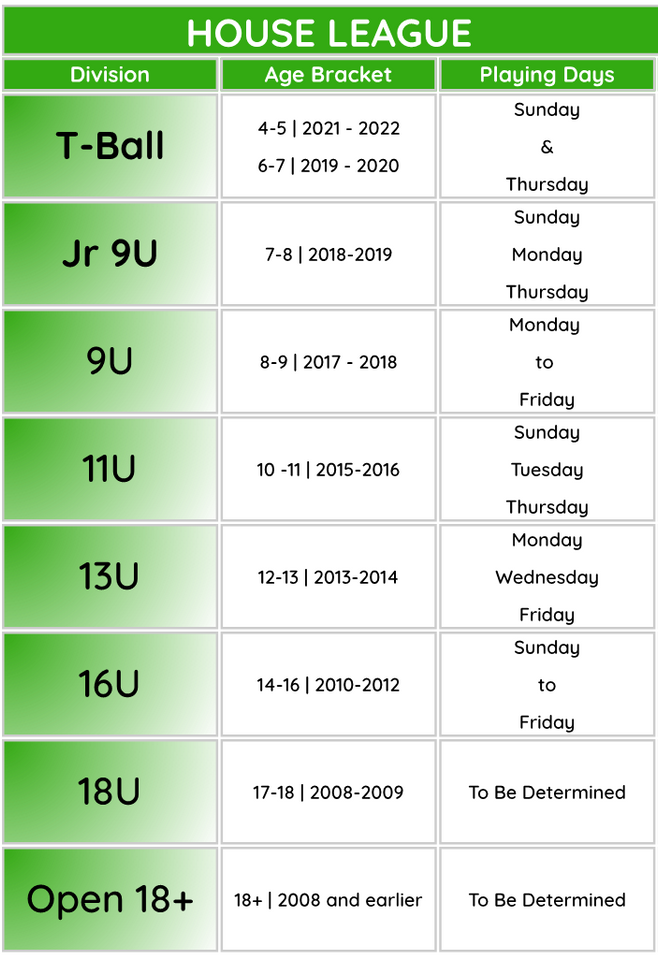 The days listed for each age group represent the standard days available for all league-scheduled and rescheduled events.